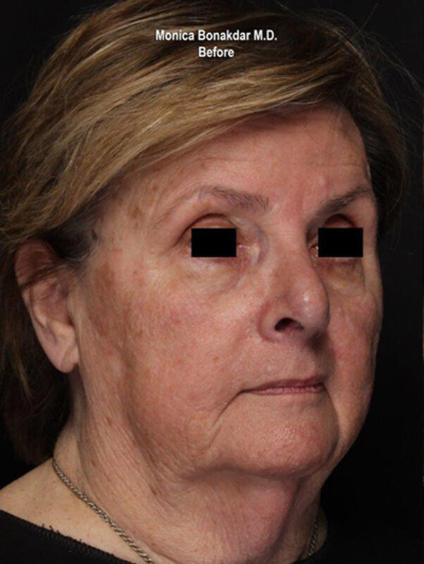 Dr. Bonakdar Explains: This is an 84 year old female with sun damage from years of boating. To reverse the signs of aging and years of sun damage from her skin, the actinic keratosis (“barnacles”) on her face was treated with a series of Vascular and CoolPeel laser treatments. Both lasers helped resurface the skin on her face. As you can see, the overall health of her skin was restored.